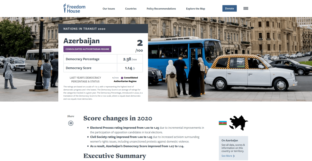 I wrote the Nations in Transit 2020 report on Azerbaijan for Freedom House. The report described the state of democracy in Azerbaijan at the outset of 2020, so it focused on events that actually occurred in 2019 and that reflected the state of civil society, press freedom, etc. Long story short, the year was marked by cosmetic reforms which solved none of the state’s structural problems: the dominance of the executive branch over all others, the dominance of the national government over local government, rampant corruption, etc. You can read the whole report at Freedom House: