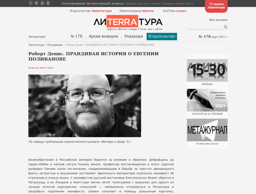 Yevgeny Polivanov (1891-1938) was perhaps the world’s greatest one-armed, opium-addicted, telepathic linguist, revolutionary, and spy. He has confounded his biographers by being so strange that even the most outlandish legends he told about himself sometimes turn out to be true. In 2020, I wrote this article about his life to accompany the publication of his unfinished novel, Evenings with Prof. P.: